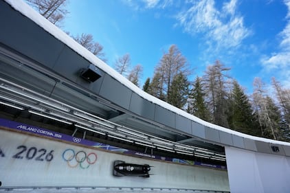 France's Margot Boch, right, and Carla Senechal slide down the track during a two women bobsled run at the 2026 Winter Olympics, in Cortina d'Ampezzo, Italy, Friday, Feb. 20, 2026. (AP Photo/Aijaz Rahi)