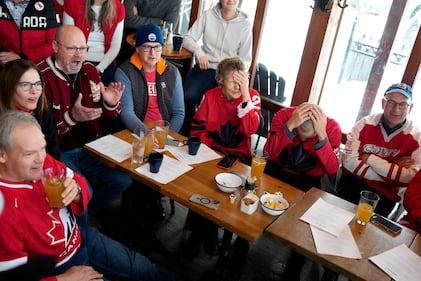 Prime Minister Mark Carney and his wife Diana Fox Carney react to a play as they watch the gold medal men's ice hockey game between Canada and the United States at the 2026 Milan Cortina Winter Olympics, at a pub in Chelsea, Que., on Sunday, Feb. 22, 2026. THE CANADIAN PRESS/Justin Tang
