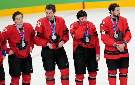 Canadian players react after receiving their silver medals after losing to the United States in the men's ice hockey gold medal game at the 2026 Winter Olympics, in Milan, Italy, Sunday, Feb. 22, 2026. (AP Photo/Luca Bruno)