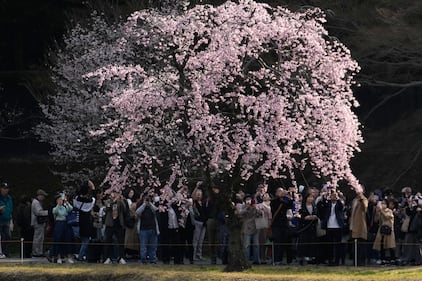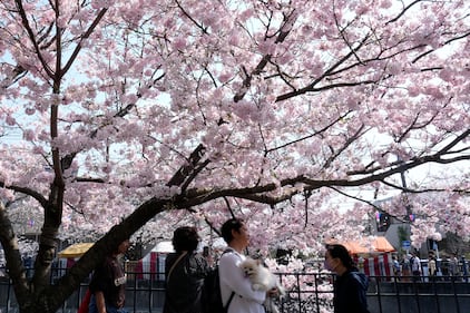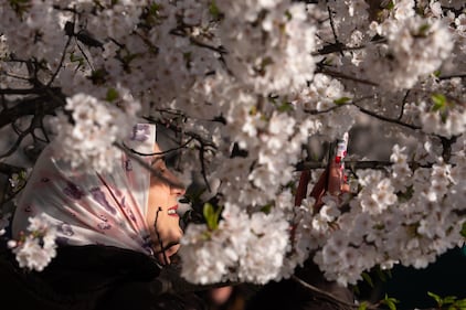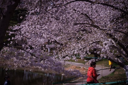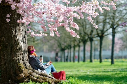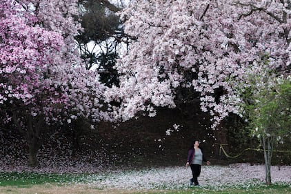 A woman sits in the castle garden by a blossoming Japanese cherry tree in Germany, March 19, 2026. (Uwe Anspach/picture alliance via Getty Images)