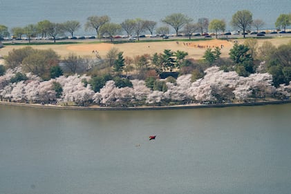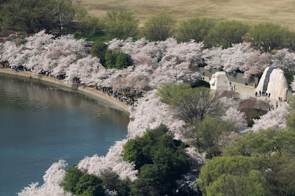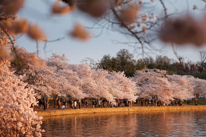 Cherry blossoms bloom around the Tidal Basin in Washington, Saturday, March 28, 2026. (AP Photo/Allison Robbert)