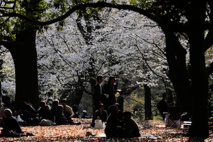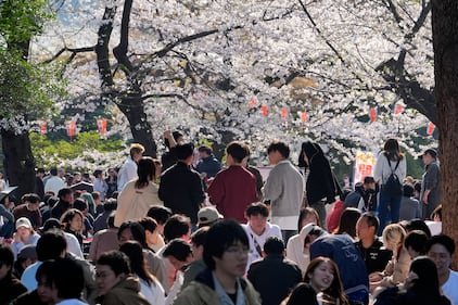 People walk under cherry blossoms at Yoyogi Park, Sunday, March 29, 2026, in Tokyo. (AP Photo/Kiichiro Sato)