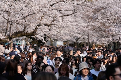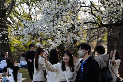People watch the cherry blossom in full bloom at a garden of the Imperial Palace in Tokyo, Friday, March 27 2026. (AP Photo/Shuji Kajiyama)