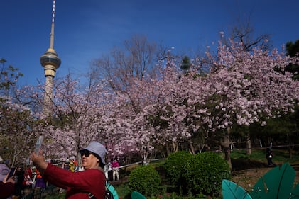 A visitor takes photos beneath blooming cherry blossoms at Yuyuantan Park during spring in Beijing, China, Friday, March 27, 2026. (AP Photo/Vincent Thian)