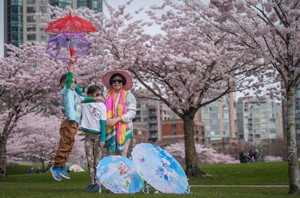 Susanna Shum poses under cherry blossom trees with her grandchildren Elias Wong, 5, and Charleigh Wong, 8, as her husband and their grandfather Harry Shum, not seen, takes photos of them at David Lam Park, in Vancouver, on Monday, March 23, 2026. THE CANADIAN PRESS/Darryl Dyck