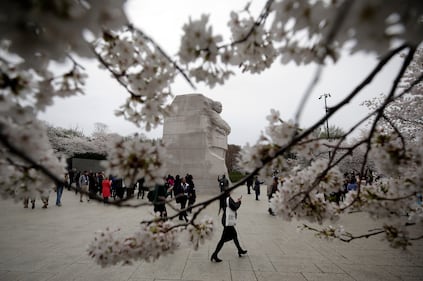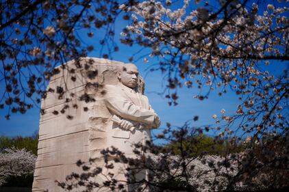 The Martin Luther King Jr. Memorial is framed by cherry blossoms in Washington, Friday, March 27, 2026. (AP Photo/Rahmat Gul)