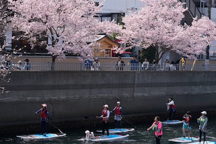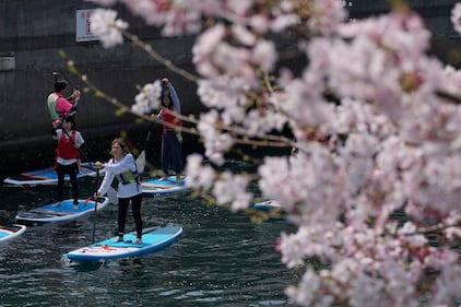 Paddleboard riders move past the cherry blossoms in bloom in Yokohama, south of Tokyo, Sunday, March 29, 2026. (AP Photo/Shuji Kajiyama)