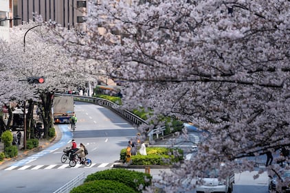 People cross a street under a canopy of cherry blossoms in Tokyo, Japan, Saturday, March 28, 2026. (AP Photo/Kiichiro Sato)