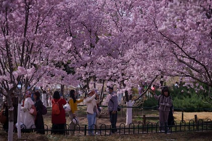 Tourists visit the East Lake Cherry Blossom Garden in Wuhan, Hubei, China on March 29, 2026. (CFOTO/Future Publishing via Getty Images)