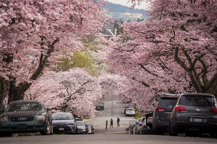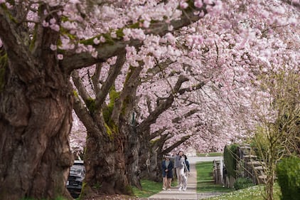 People walk down a street lined with cherry blossom trees in full bloom, in Vancouver, on Monday, March 23, 2026. THE CANADIAN PRESS/Darryl Dyck
