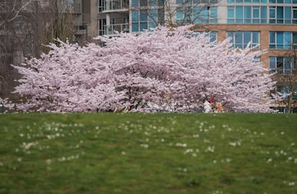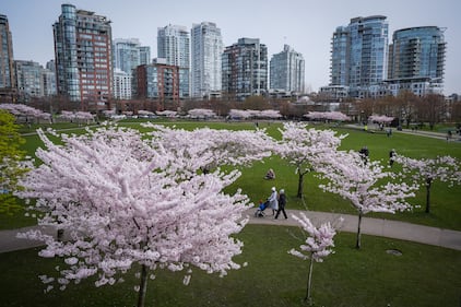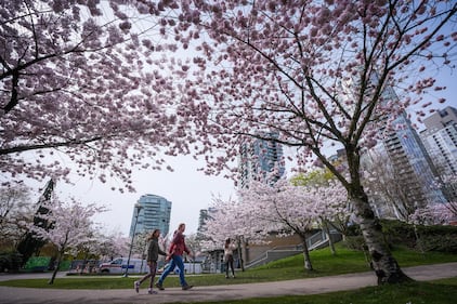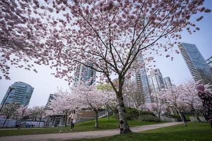 People walk past cherry blossoms in full bloom at David Lam Park, in Vancouver, on Monday, March 23, 2026. THE CANADIAN PRESS/Darryl Dyck