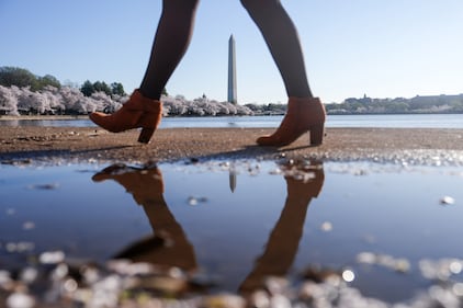 The Washington Monument is reflected in a puddle along the Tidal Basin, Saturday, March 28, 2026, in Washington. (AP Photo/Julia Demaree Nikhinson)