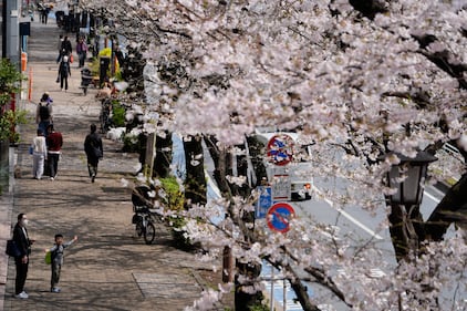 People walk past cherry blossoms in bloom in Yokohama, south of Tokyo, Sunday, March 29, 2026. (AP Photo/Shuji Kajiyama)