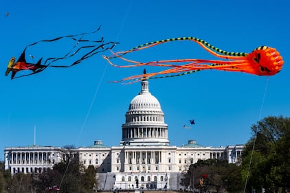 Kites fly on the National Mall in front of the U.S. Capitol during the Blossom Kite Festival, Saturday, March 28, 2026, in Washington. (AP Photo/Alex Brandon)