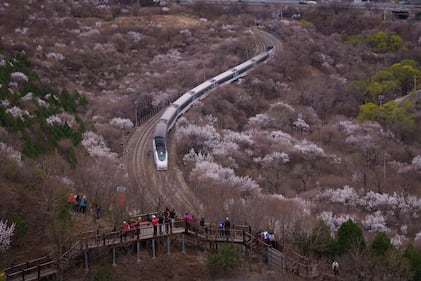 A China high speed train passes by blooming peach blossoms next to the Juyongguan Great Wall outside Beijing, China, Monday, March 30, 2026. (AP Photo/Vincent Thian)