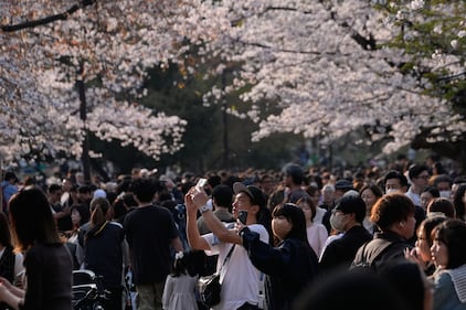 People take pictures under cherry blossoms at Yoyogi Park, Sunday, March 29, 2026, in Tokyo. (AP Photo/Kiichiro Sato)