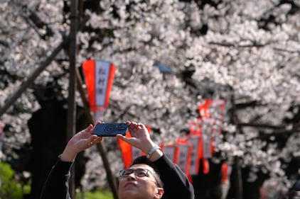 A visitor takes a picture of cherry blossoms at Ueno Park in Tokyo, Japan, Saturday, March 28, 2026. (AP Photo/Kiichiro Sato)