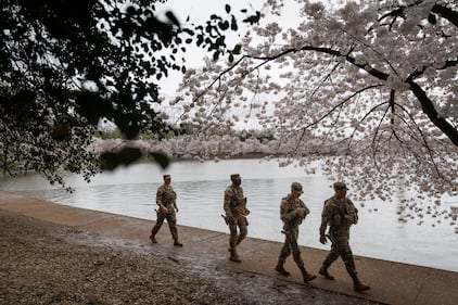 Members of the Mississippi National Guard patrol near the cherry blossom trees along the tidal basin on the National Mall on Friday, March 27, 2026, in Washington. (AP Photo/Tom Brenner)