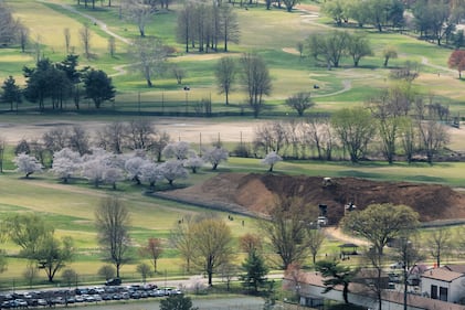 Cherry blossoms bloom amid construction at the East Potomac Links Golf Course in Washington, Saturday, March 28, 2026. (AP Photo/Allison Robbert)