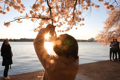 A person photographs cherry blossom trees at sunrise Saturday, March 28, 2026, along the Tidal Basin in Washington. (AP Photo/Julia Demaree Nikhinson)