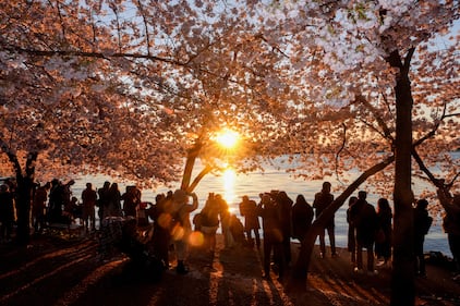 People gather to observe sunrise among the cherry blossom trees along the tidal basin, on Wednesday, March 25, 2026, in Washington. (AP Photo/Tom Brenner)