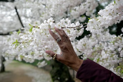 Donna Clarke, from Maryland, touches cherry blossoms along the tidal basin on the National Mall in Washington, Friday, March 27, 2026. (AP Photo/Rahmat Gul)
