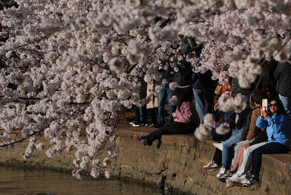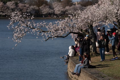 People look at cherry blossom trees along the Tidal Basin, Saturday, March 28, 2026, in Washington. (AP Photo/Julia Demaree Nikhinson)