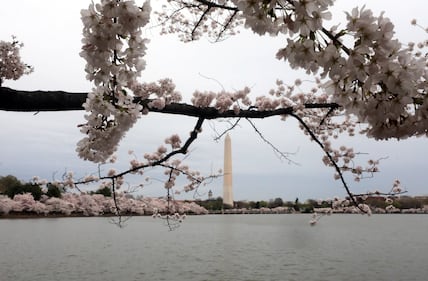 The Washington Monument is framed by branches of cherry blossoms along the tidal basin on the National Mall in Washington, Friday, March 27, 2026. (AP Photo/Rahmat Gul)