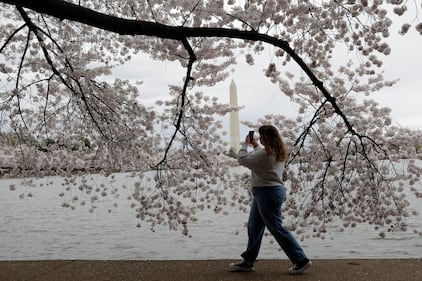 A woman makes photos of cherry blossom trees as she walks along the tidal basin on the National Mall in Washington, Friday, March 27, 2026. (AP Photo/Rahmat Gul)