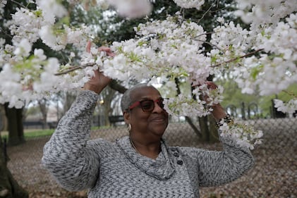 Donna Clarke, from Maryland, poses for a photograph with cherry blossoms along the tidal basin on the National Mall in Washington, Friday, March 27, 2026. (AP Photo/Rahmat Gul)