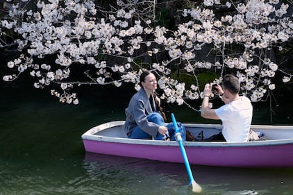 People ride a boat under as the cherry blossoms in full bloom at the Chidorigafuchi palace moat in Tokyo, Friday, March 27 2026. (AP Photo/Shuji Kajiyama)
