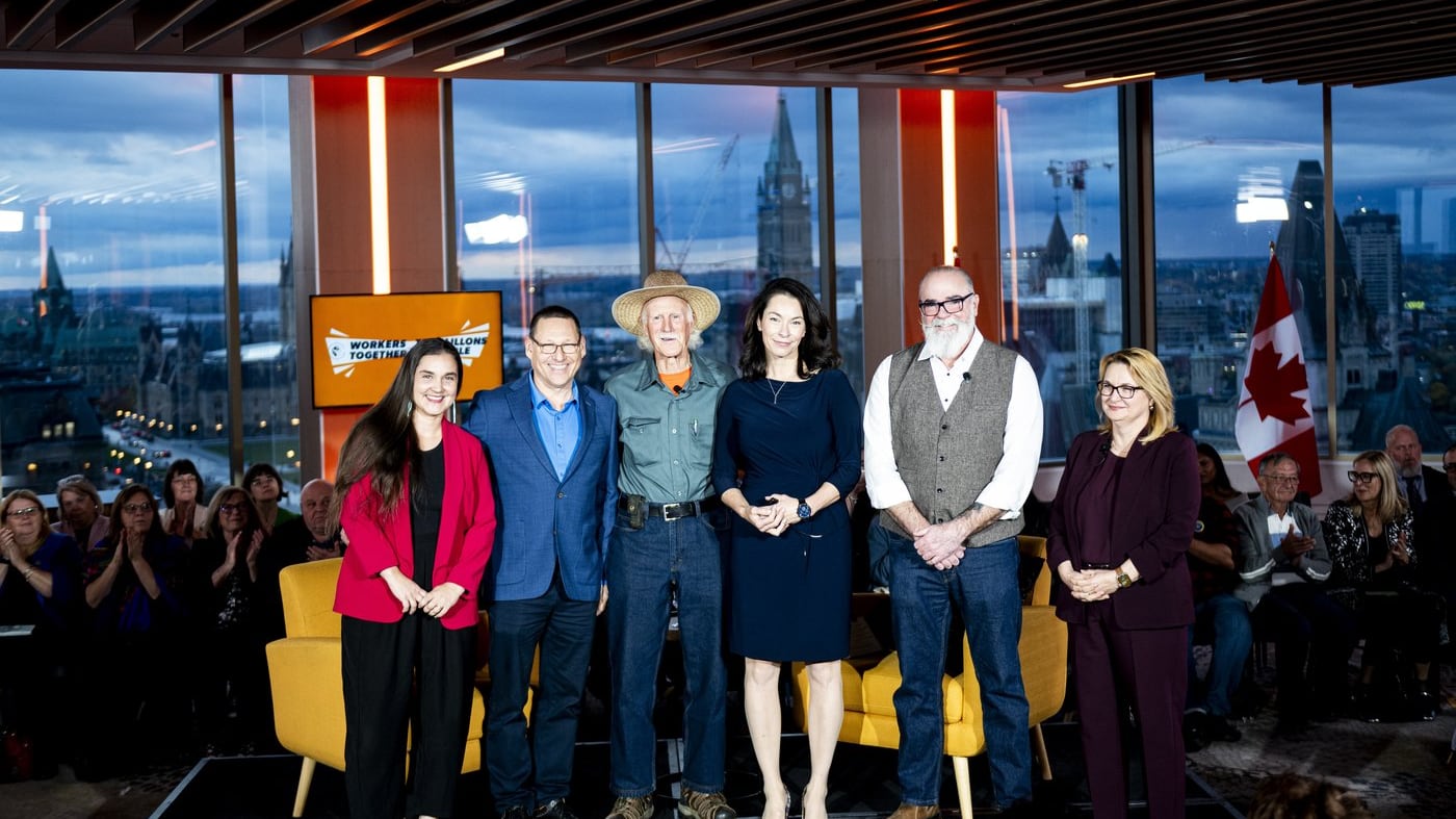 NDP leadership candidates (left to right) Tanille Johnston, Avi Lewis, Tony McQuail, Heather McPherson and Rob Ashton, and president of the Canadian Labour Congress (CLC) Bea Bruske, pose for a family photo ahead of the NDP Leadership forum in Ottawa on Wednesday, Oct. 22, 2025. THE CANADIAN PRESS/Spencer Colby