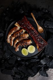 “It's served with grilled wild Argentinian shrimp that have been marinated in garlic and a salt made from pasilla chilies, chintextle and hand pressed tortillas.