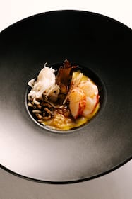 Alo “(This) is a version of one of our signature dishes. It's a koshihikari rice from Ibakari Japan prepared in a similar style to a risotto with a porcini emulsion, Nova Scotia lobster, puffed rice, maitake and matsutake mushrooms, and kohlrabi. The rice is prepared in a donabe pot, and as a signature dish we are always evolving this rice course.”