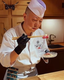 Sushi Masaki Saito Its omakase menu is served in an intimate space, complete with a 200-year-old hinoki counter and traditional Japanese paneling as the restaurant’s namesake, pictured here, serves up some of the best sushi the city has to offer.