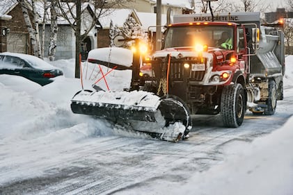 A snowplow clears snow from a residential road the morning after a winter snowstorm hits in Toronto on Jan. 26, 2026. (Creative Touch Imaging Ltd./NurPhoto via Getty Images)