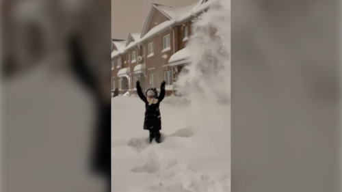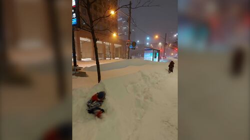 A child makes a snow angel in downtown Toronto on Sunday, Jan. 25, 2026. (Daisy Cocchella)
