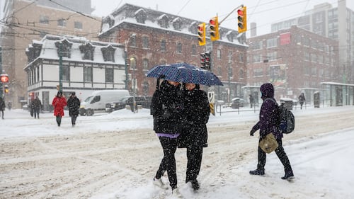 People walk through snow in downtown Toronto as a winter storm moves through the region with Environment Canada warning of peak snowfall rates of 5 to 8 cm per hour, Sunday, January 25, 2026.THE CANADIAN PRESS/Cole Burston