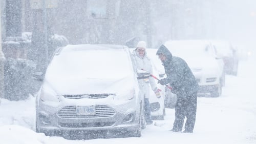 People clear snow from a car on Beverley Street during a snow storm in Toronto on January 25, 2026. (Arlyn McAdorey/Toronto Star via Getty Images)