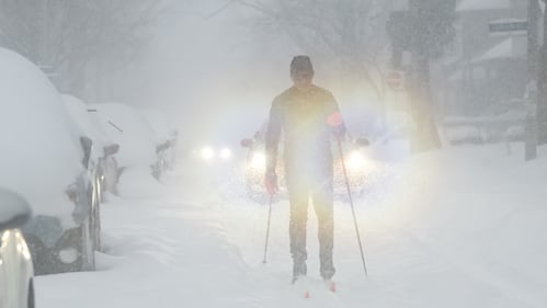 A person cross-country skis in Toronto, as Environment Canada warns of peak snowfall rates of five to eight centimetres per hour as a winter storm moves through the region, Sunday, Jan. 25, 2026. THE CANADIAN PRESS/Cole Burston
