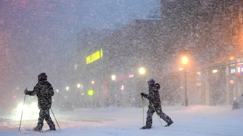 People using cross-country skis cross the road during snowstorm in Toronto, Ontario, Canada on January 25, 2026. (Mert Alper Dervis/Anadolu via Getty Images)