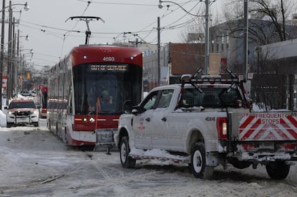 TTC crews dig out and get a derailed 501 streetcar back on track at Queen and Coxwell in Toronto, Jan. 26, 2026. (Steve Russell/Toronto Star via Getty Images)