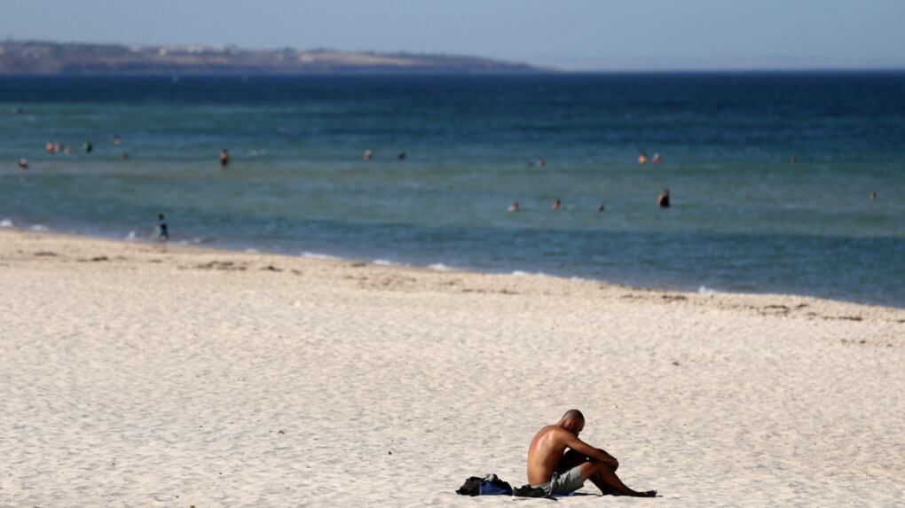 A beachgoer sits in the sun on Glenelg Beach in Adelaide, Australia, on Jan. 24, 2019. (Kelly Barnes / AAP Image via AP)